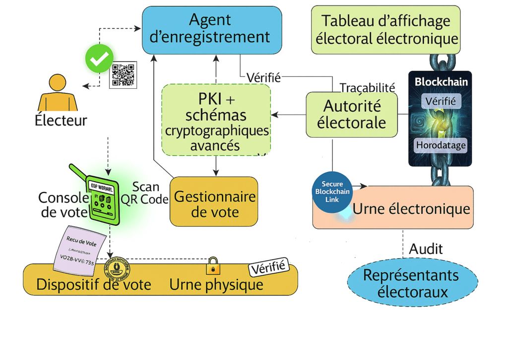 Ce schéma présente un système de vote électronique sécurisé basé sur la blockchain. L’électeur s’enregistre auprès d’un agent, puis vote sur un dispositif qui chiffre et anonymise son bulletin tout en générant une preuve de validité. Il reçoit un reçu vérifiable lui permettant de contrôler que son vote a bien été enregistré, sans révéler son choix. Le bulletin chiffré est envoyé vers l’urne électronique, dont l’intégrité est garantie par la blockchain via un lien sécurisé. Une urne physique peut compléter le dispositif comme ancrage de confiance. L’autorité électorale supervise l’ensemble, valide les opérations critiques et publie les données vérifiées sur un tableau d’affichage électronique pour une transparence totale.